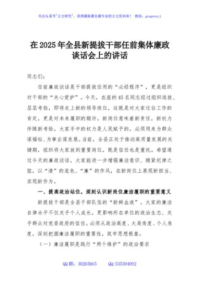 / 在2025年全县新提拔干部任前集体廉政谈话会上的讲话