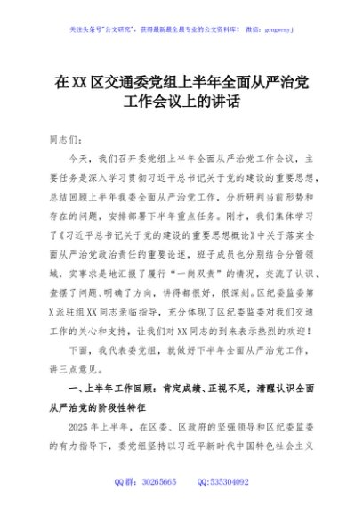 / 在XX区交通委党组上半年全面从严治党工作会议上的讲话