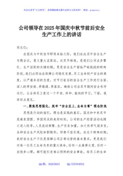 / 公司领导在2025年国庆中秋节前后安全生产工作上的讲话