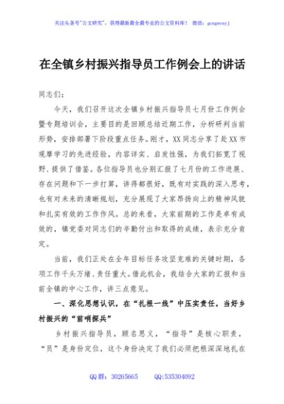 / 在全镇乡村振兴指导员工作例会上的讲话