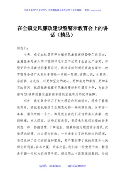 / 在全镇党风廉政建设暨警示教育会上的讲话(精品)