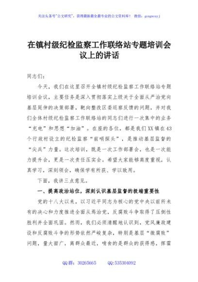/ 在镇村级纪检监察工作联络站专题培训会议上的讲话