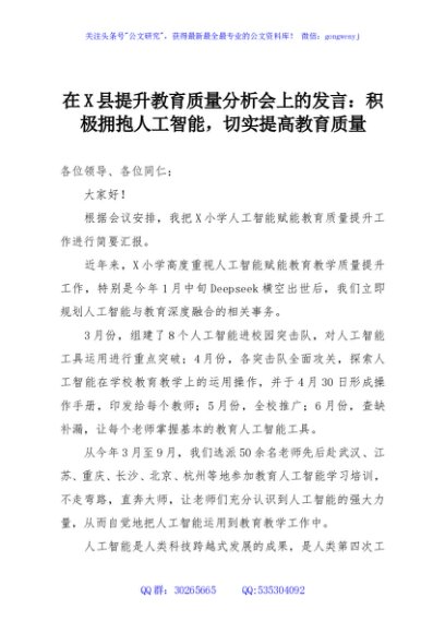 在X县提升教育质量分析会上的发言:积极拥抱人工智能,切实提高教育质量