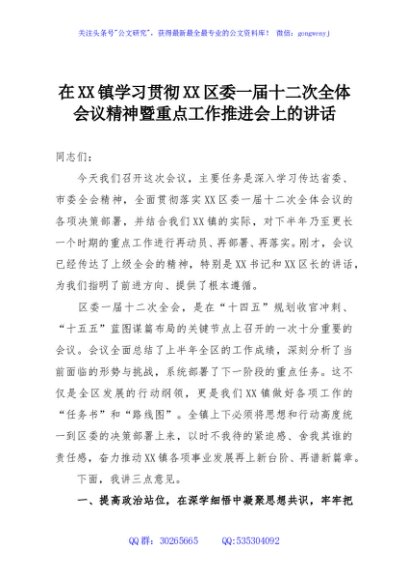 / 在XX镇学习贯彻XX区委一届十二次全体会议精神暨重点工作推进会上的讲话
