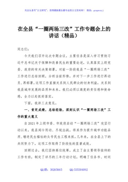 / 在全县“一圈两场三改”工作专题会上的讲话(精品)