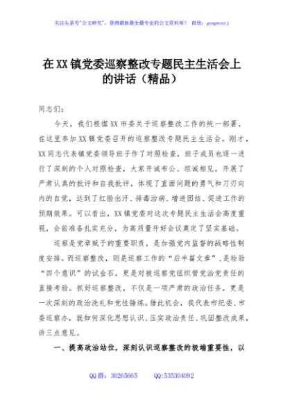 / 在XX镇党委巡察整改专题民主生活会上的讲话(精品)