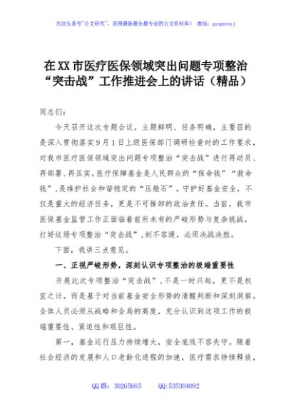 / 在XX市医疗医保领域突出问题专项整治“突击战”工作推进会上的讲话(精品)