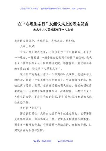 / 在“心理生态日”发起仪式上的表态发言