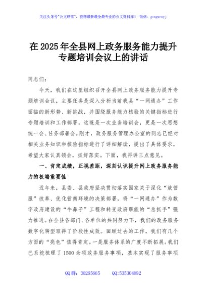 / 在2025年全县网上政务服务能力提升专题培训会议上的讲话