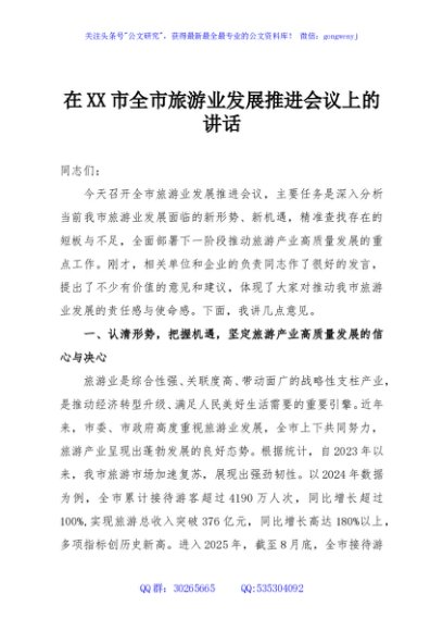 / 在XX市全市旅游业发展推进会议上的讲话