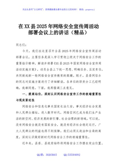 / 在XX县2025年网络安全宣传周活动部署会议上的讲话(精品)