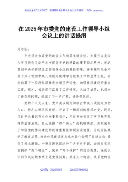 / 在2025年市委党的建设工作领导小组会议上的讲话提纲