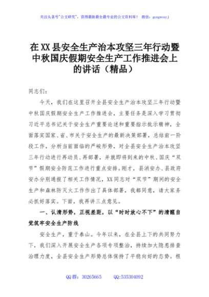 / 在XX县安全生产治本攻坚三年行动暨中秋国庆假期安全生产工作推进会上的讲话(精品)
