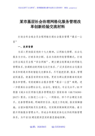 / 某市基层社会治理网格化服务管理改革创新经验交流材料