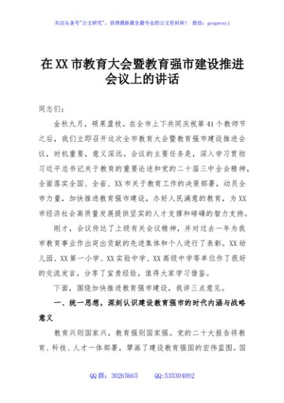 / 在XX市教育大会暨教育强市建设推进会议上的讲话