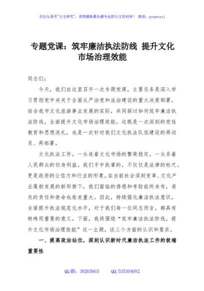 / 专题党课:筑牢廉洁执法防线 提升文化市场治理效能