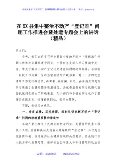/ 在XX县集中整治不动产“登记难”问题工作推进会暨处遗专题会上的讲话(精品)