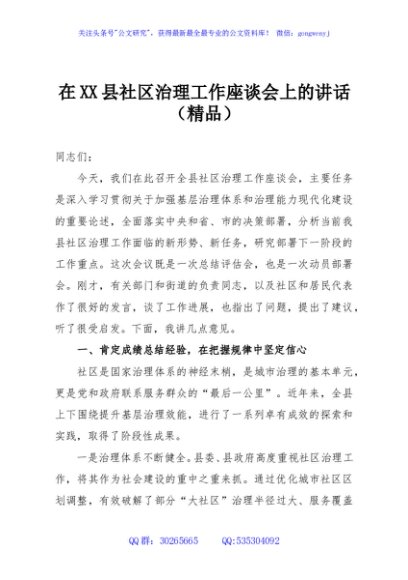 / 在XX县社区治理工作座谈会上的讲话(精品)