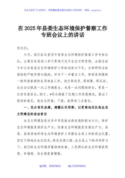 / 在2025年县委生态环境保护督察工作专班会议上的讲话
