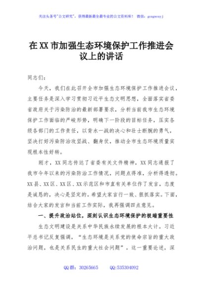 / 在XX市加强生态环境保护工作推进会议上的讲话
