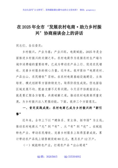 / 在2025年全市‘发展农村电商·助力乡村振兴’协商座谈会上的讲话