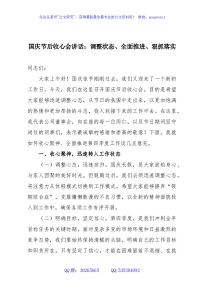 / 国庆节后收心会讲话:调整状态、全面推进、狠抓落实