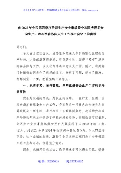 / 在2025年全区第四季度防范生产安全事故暨中秋国庆假期安全生产、秋冬季森林防灭火工作推进会议上的讲话
