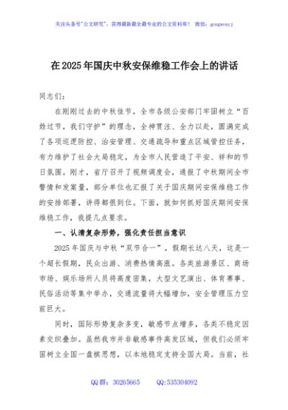 / 在2025年国庆中秋安保维稳工作会上的讲话