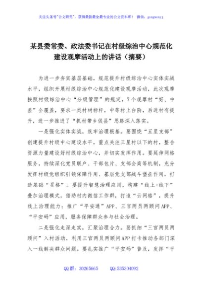 / 某县委常委、政法委书记在村级综治中心规范化建设观摩活动上的讲话(摘要)