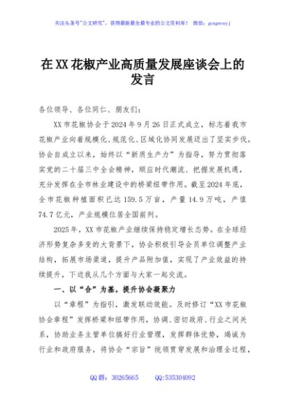 / 在XX花椒产业高质量发展座谈会上的发言