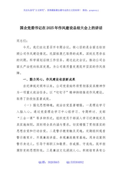 / 国企党委书记在2025年作风建设总结大会上的讲话
