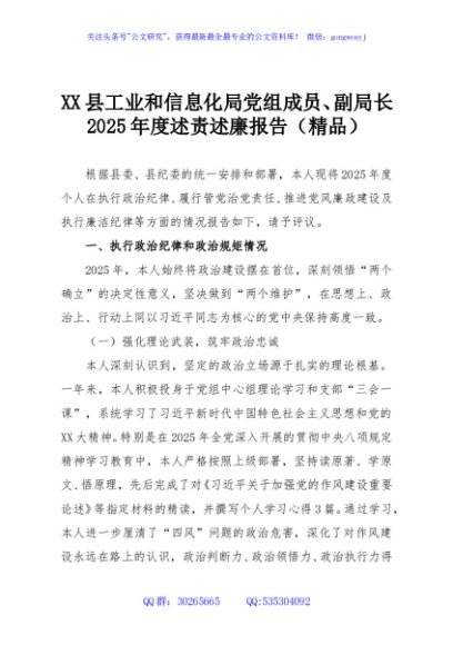 / XX县工业和信息化局党组成员、副局长2025年度述责述廉报告(精品)