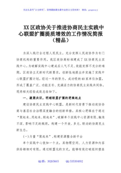/ XX区政协关于推进协商民主实践中心联盟扩圈提质增效的工作情况简报(精品)