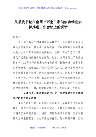 / 某县委书记在全国“两会”期间信访维稳安保推进工作会议上的讲话