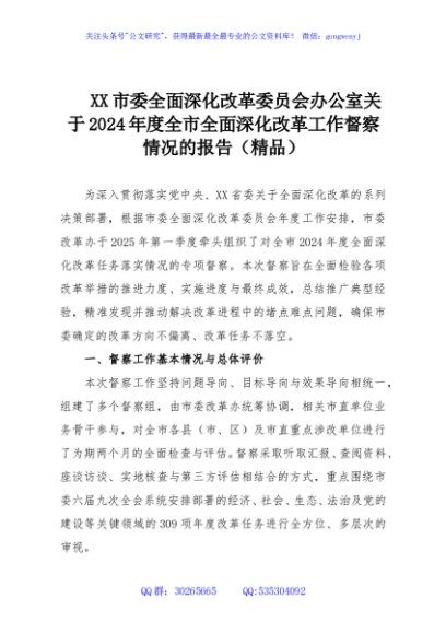 / XX市委全面深化改革委员会办公室关于2024年度全市全面深化改革工作督察情况的报告(精品)