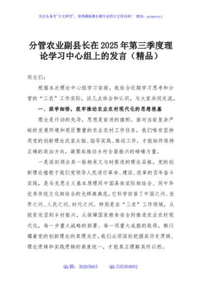/ 分管农业副县长在2025年第三季度理论学习中心组上的发言(精品)