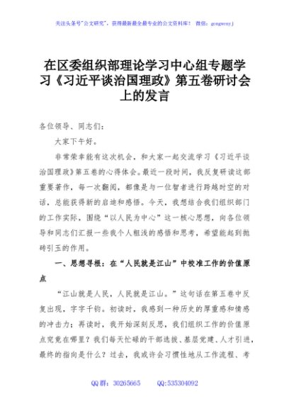 / 在区委组织部理论学习中心组专题学习《习近平谈治国理政》第五卷研讨会上的发言