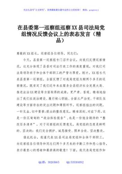 / 在县委第一巡察组巡察XX县司法局党组情况反馈会议上的表态发言(精品)