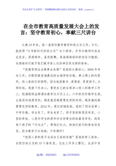 / 在全市教育高质量发展大会上的发言:坚守教育初心,奉献三尺讲台