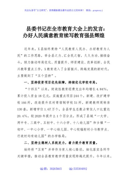 / 县委书记在全市教育大会上的发言:办好人民满意教育续写教育强县辉煌