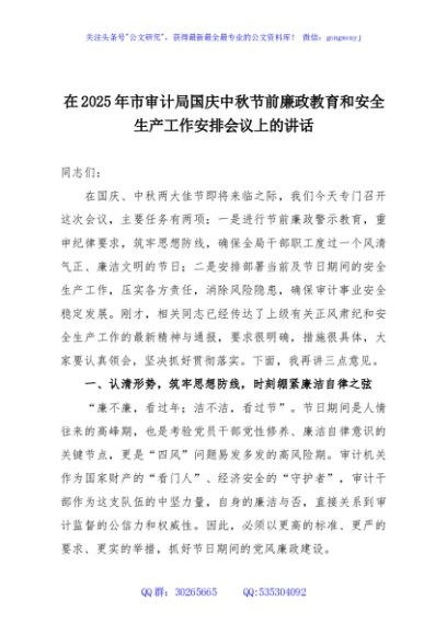 / 在2025年市审计局国庆中秋节前廉政教育和安全生产工作安排会议上的讲话