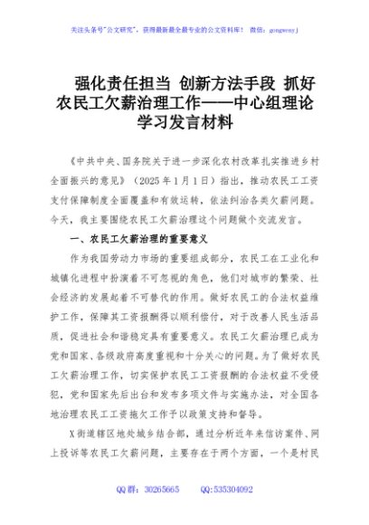 / 强化责任担当 创新方法手段 抓好农民工欠薪治理工作——中心组理论学习发言材料