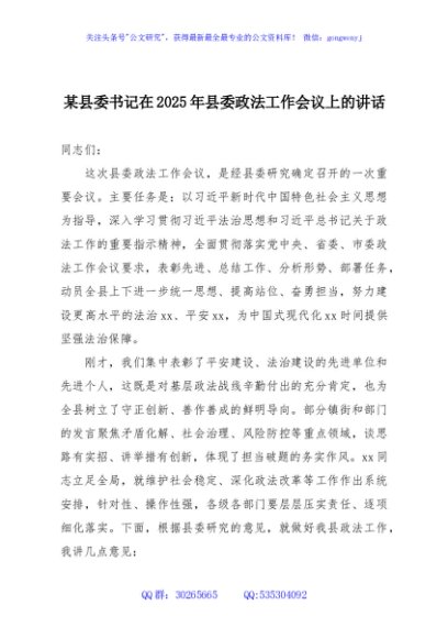 / 某县委书记在2025年县委政法工作会议上的讲话