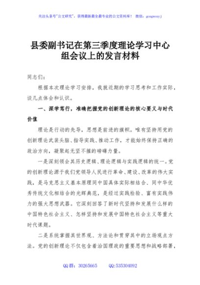 / 县委副书记在第三季度理论学习中心组会议上的发言材料