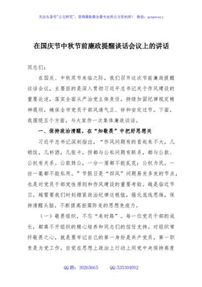 / 在国庆节中秋节前廉政提醒谈话会议上的讲话
