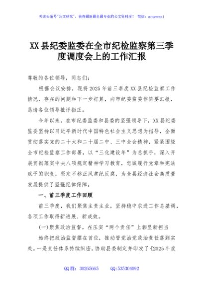 / XX县纪委监委在全市纪检监察第三季度调度会上的工作汇报