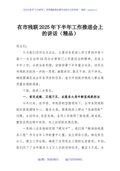 / 在市残联2025年下半年工作推进会上的讲话(精品)
