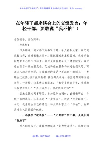 / 在年轻干部座谈会上的交流发言:年轻干部,要敢说“我不怕”!