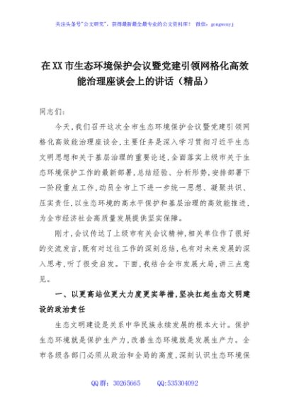 / 在XX市生态环境保护会议暨党建引领网格化高效能治理座谈会上的讲话(精品)