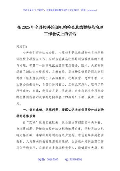 / 在2025年全县校外培训机构检查总结暨规范治理工作会议上的讲话